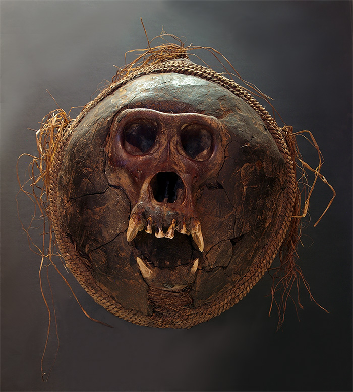 Important fétiche "bumba" ou "nbumba" peuple Villi et Yombé République démocratique du Congo. Crâne de Gorille Rotang gléné (vannerie)forme le pannier tressé. Argile Ce nkisi (force magique) serait utilisé comme régulateur social , comme objet térapeutique ou encore piége magique (obstacle à la sorcellerie). Cf. "Le bumba" , Raoul Lehuard, Arts d'afrique noire N°96 , 1995. Provenance: Collection Verité, Paris. |