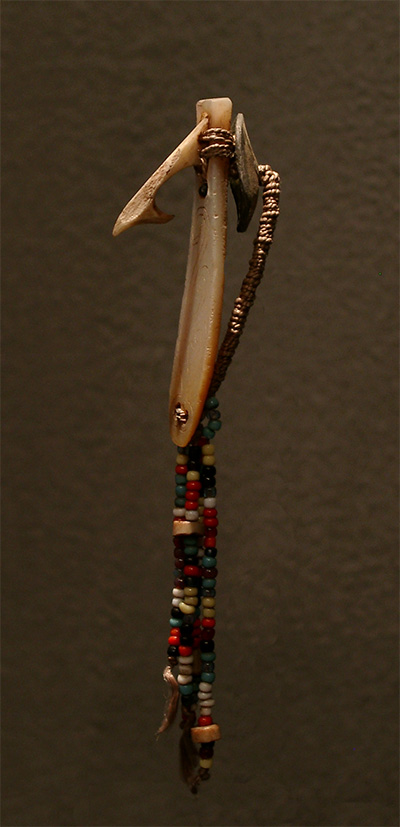 Hameçon polynésien en os , nacre gravée, perles de verre, fibres végétales et plomb.